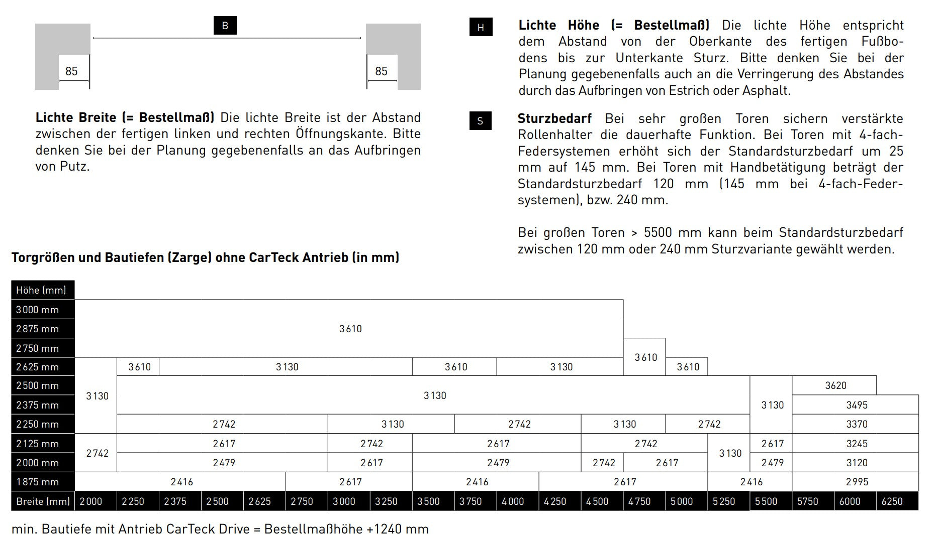 Damit die Montage nach Herstellervorgaben erfolgen kann, müssen die nachfolgenden Einbaudaten für die gewählte Bestellgröße zwingend berücksichtigt werden. Dadurch wird ein problemloser und zeitsparender Einbau des neuen Sektionaltores erreicht. Achten Sie hierbei auf die notwendigen seitlichen Anschläge von jeweils 85mm, die Einbautiefe, den Sturzbedarf von 120mm und den zur Montage notwendigen Freiraum.